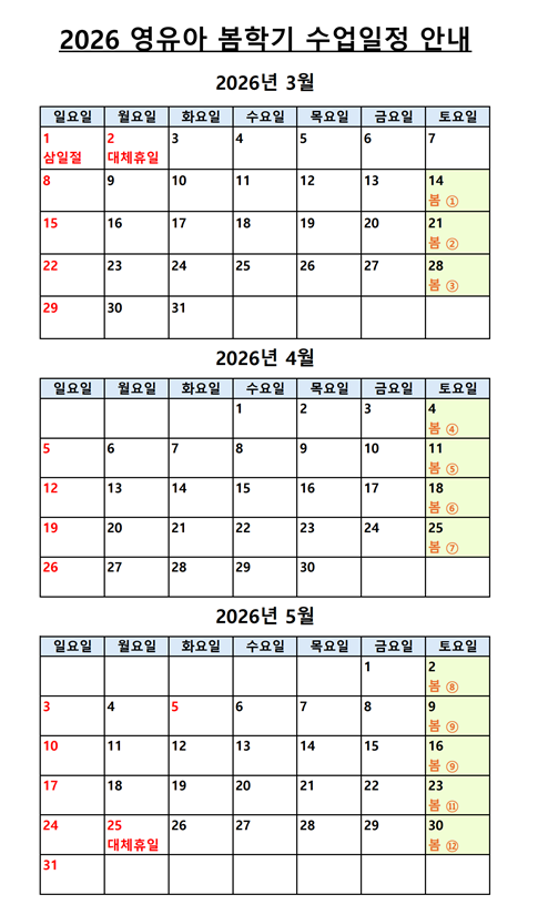 **2026 봄학기 수강학생 2026년도 나이 기준입니다** 2020년생 7세 / 2021년생 6세 / 2022년생 5세 / 2023년생 4세
