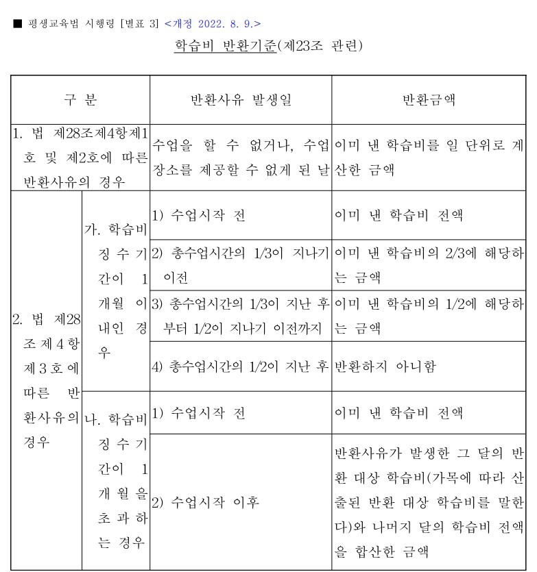 (학습비의 반환 등) 및 학원의 설립•운영 및 과외 교습에 관한 법률 시행령